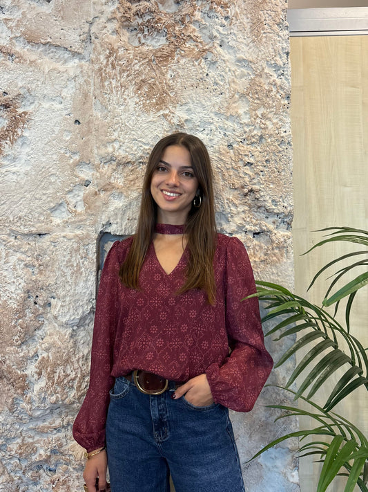 BLUSA CUELLO HALTER ESTAMPADO BURDEOS