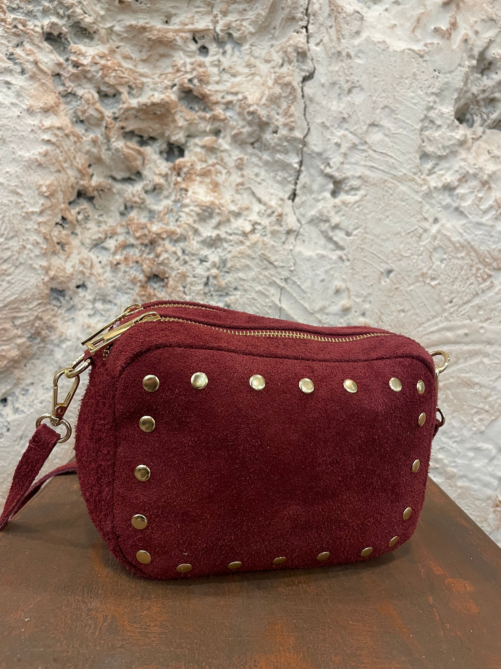 BANDOLERA DE PIEL CON TACHAS BURDEOS