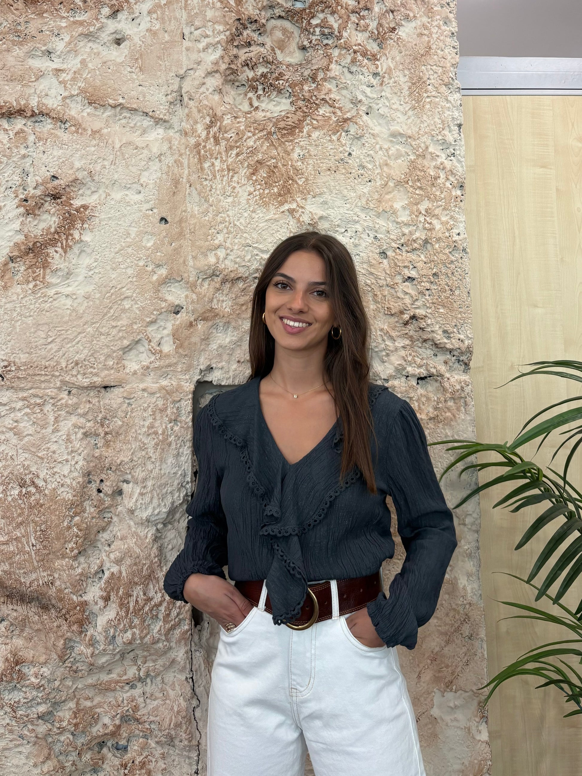 BLUSA GRIS VOLANTE CENTRAL-PUNTILLA