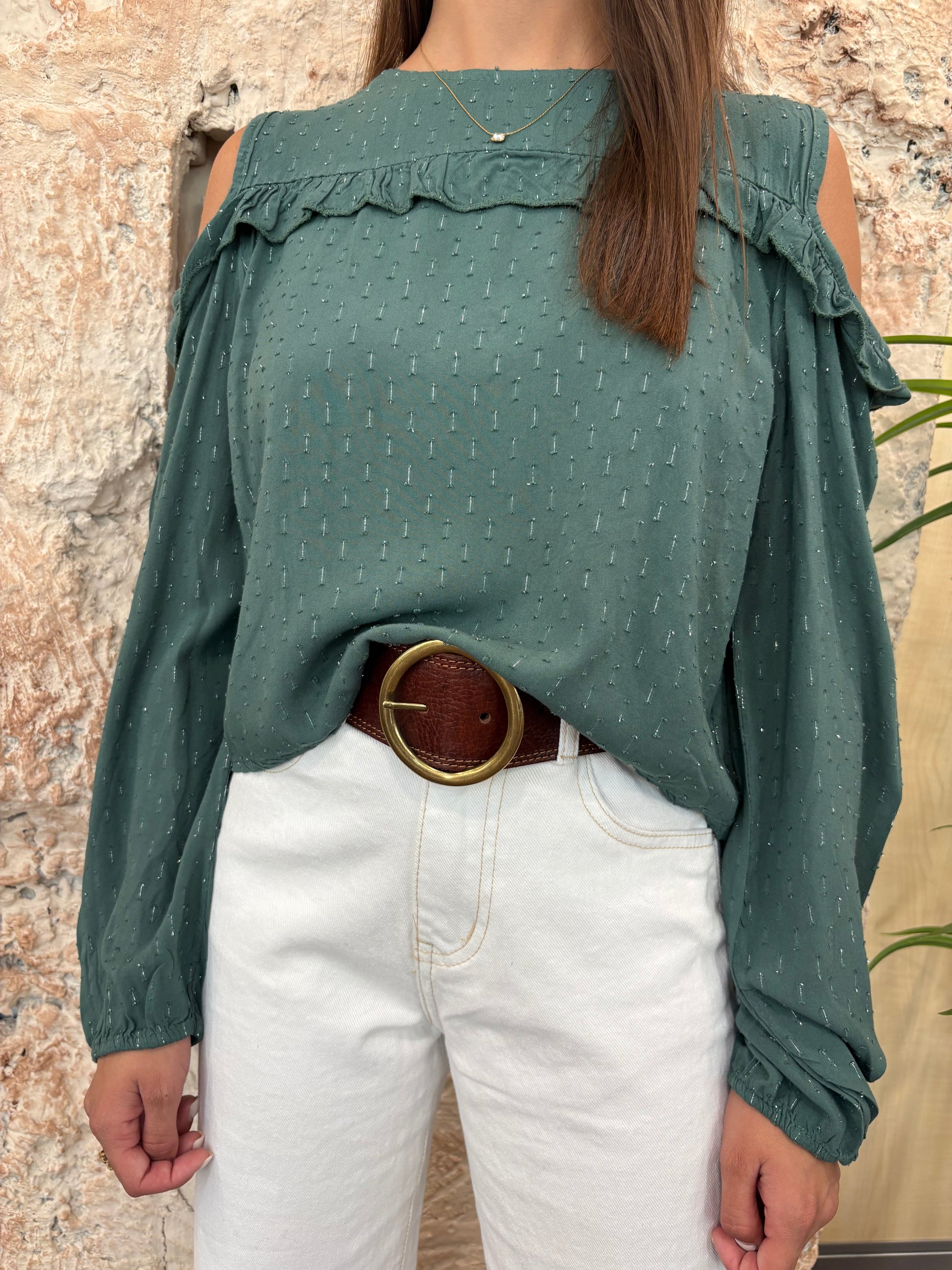 BLUSA VERDE GLITTER HOMBRO DESCUBIERTO