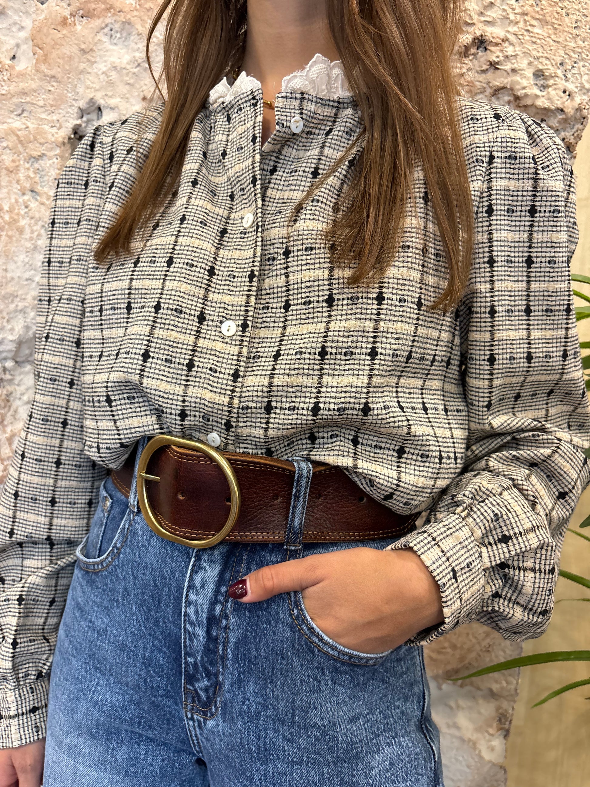 CAMISA ESTAMPADA CUELLO PUNTILLA NEGRO-BEIGE