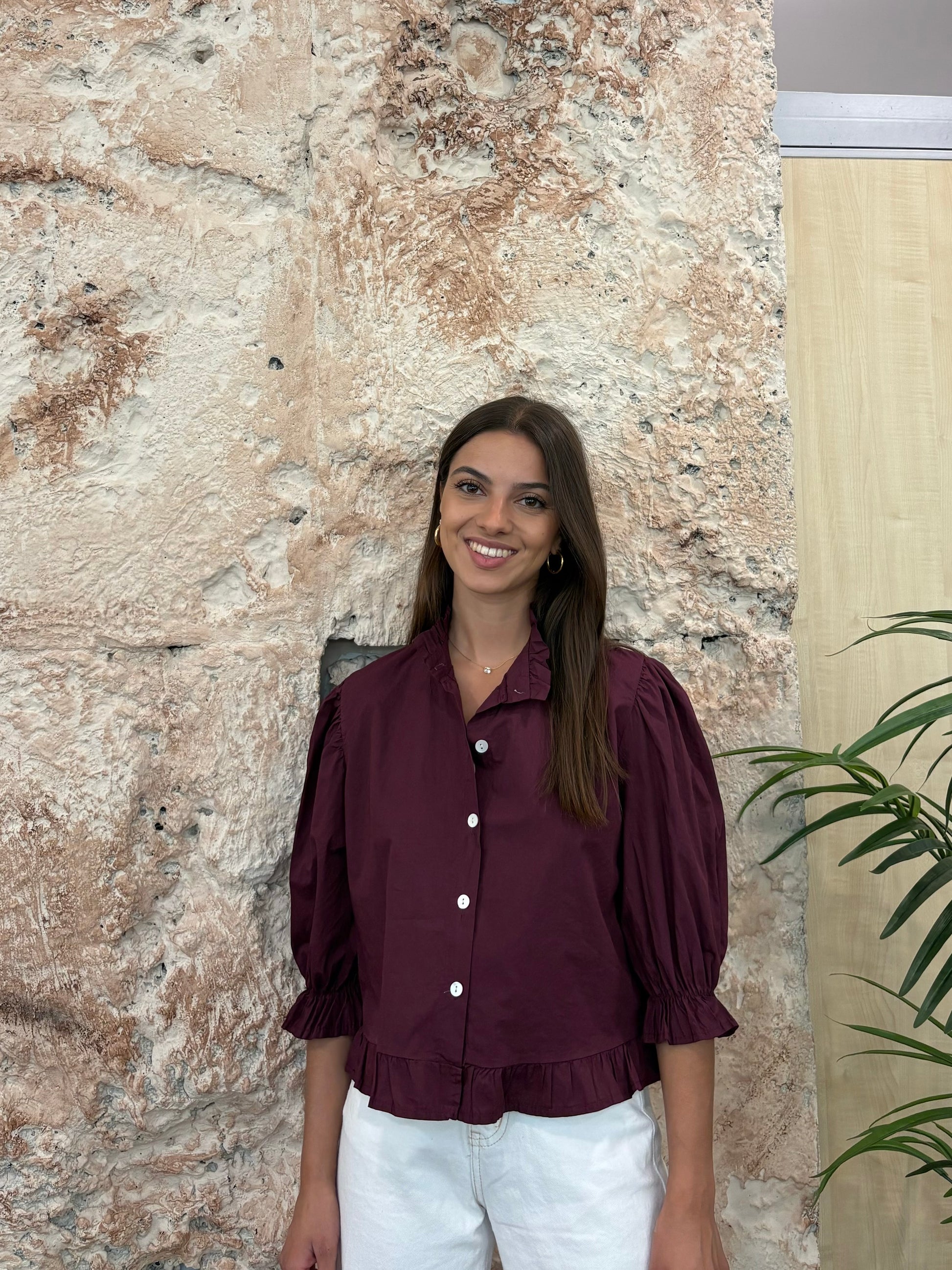 CAMISA CUELLO RIZO/VOLANTE BURDEOS