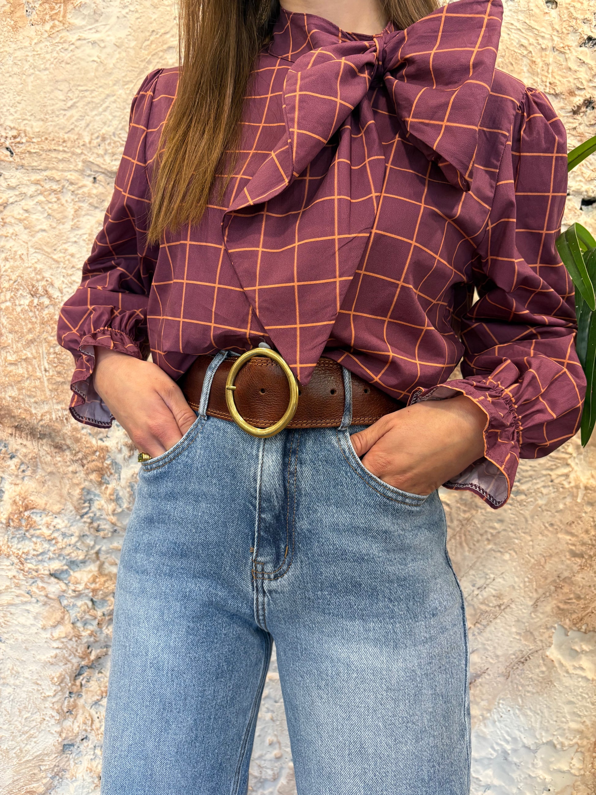 CAMISA LAZADA MORADA CUADROS NARANJA